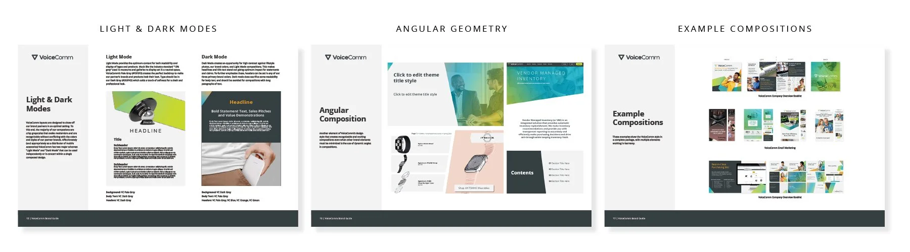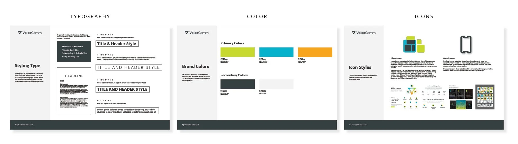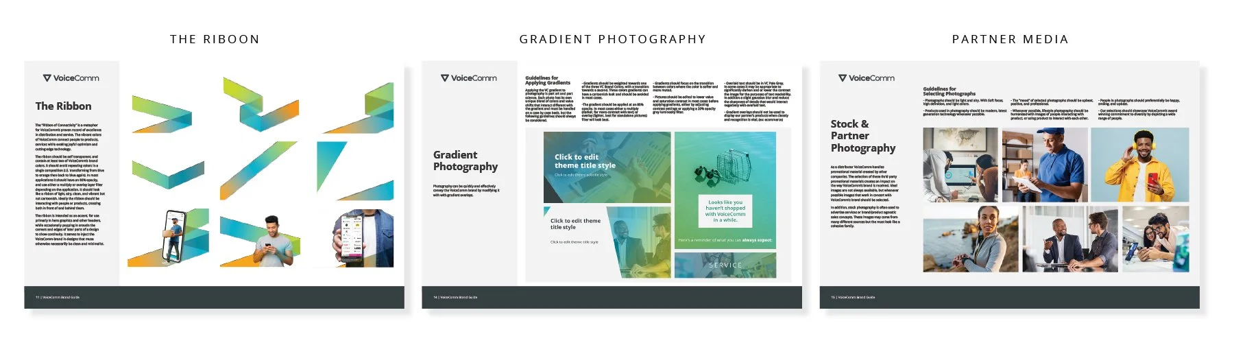 These core needs served as the foundation for the subsequent stages of the brand refresh, guiding the strategic decisions made to enhance and revitalize VoiceComm's visual identity. Below are a selection of pages from VoiceComm’s new Brand Guide and a little bit of the new strategy they outline.